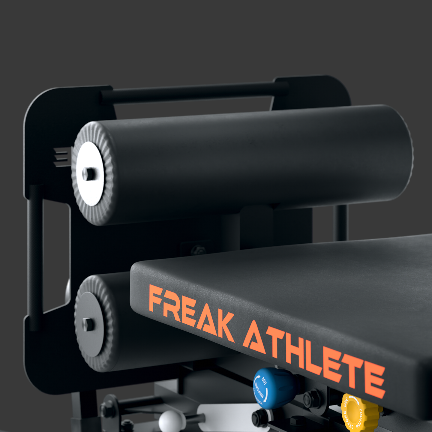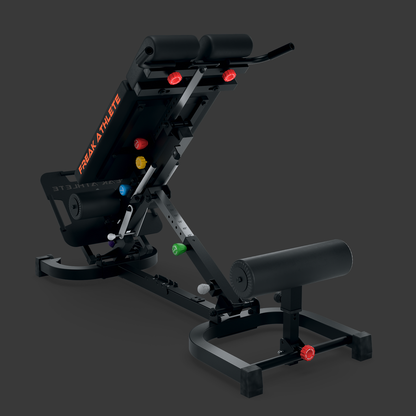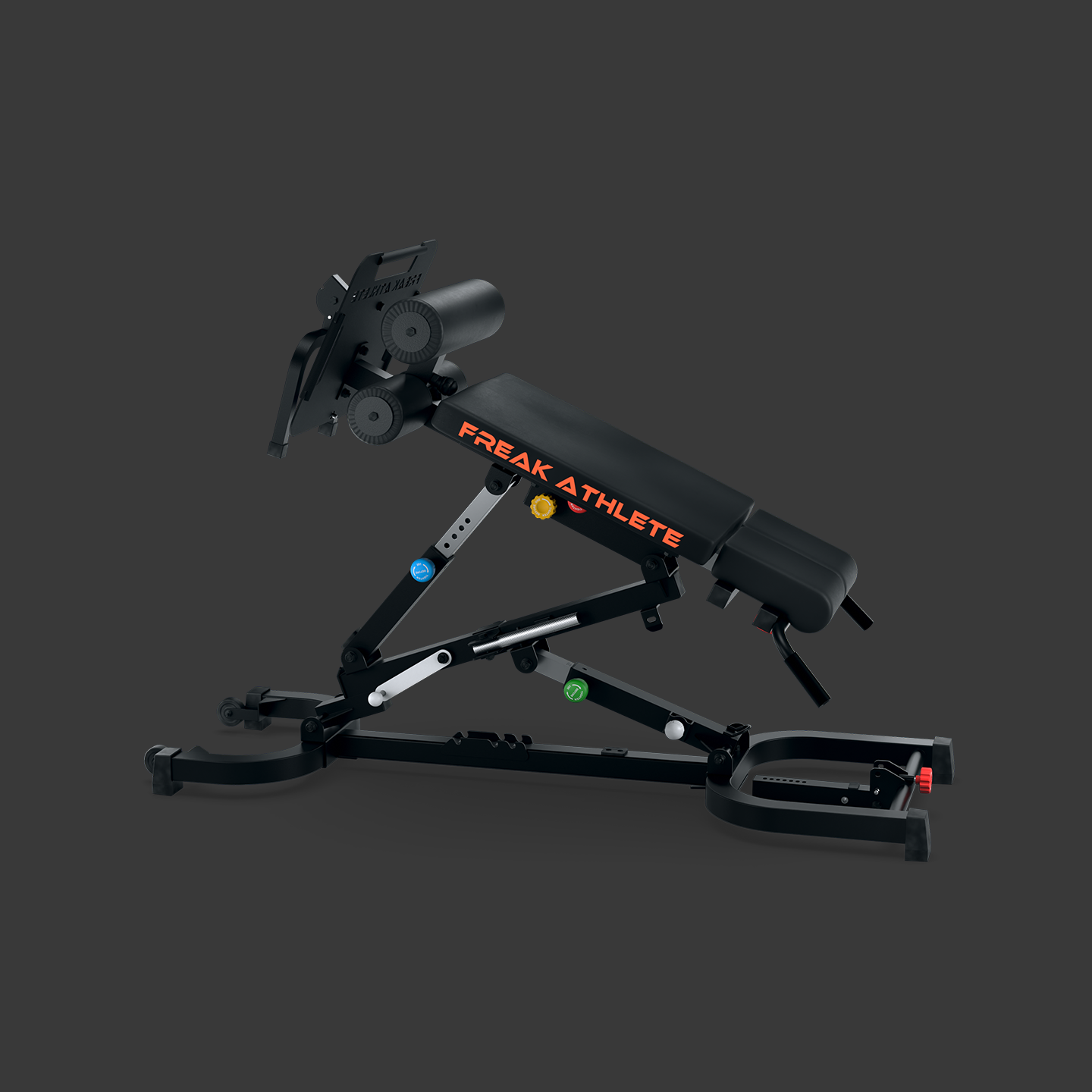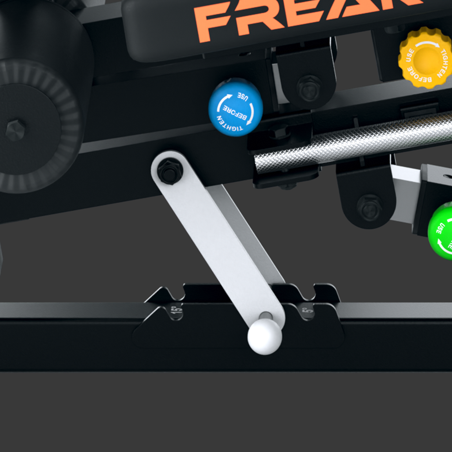 Use the green knob to adjust incline or decline. Recommended position is 20° front incline to create a 25° decline.