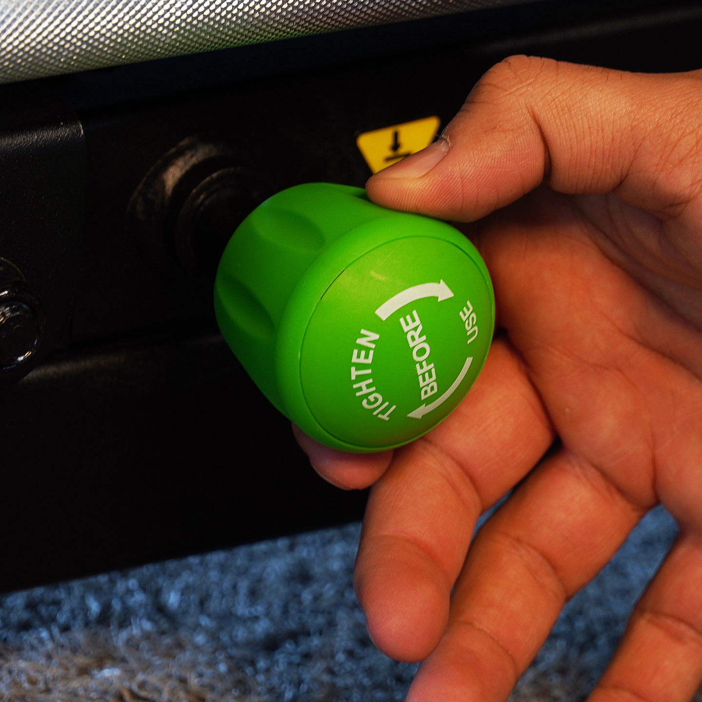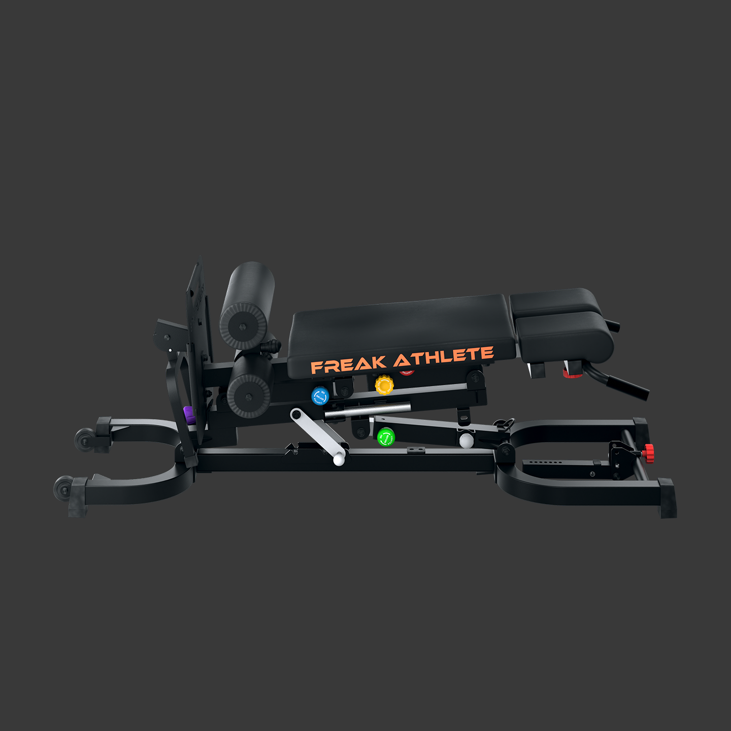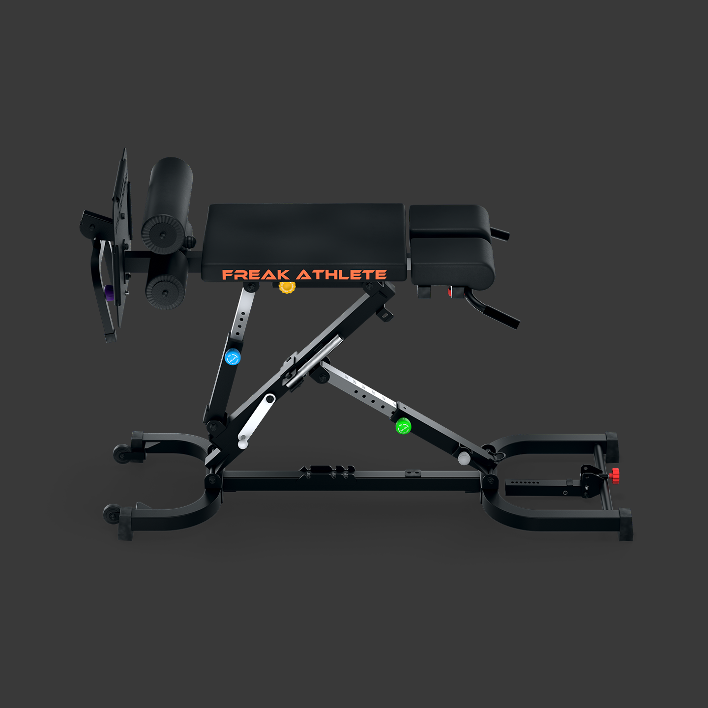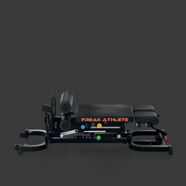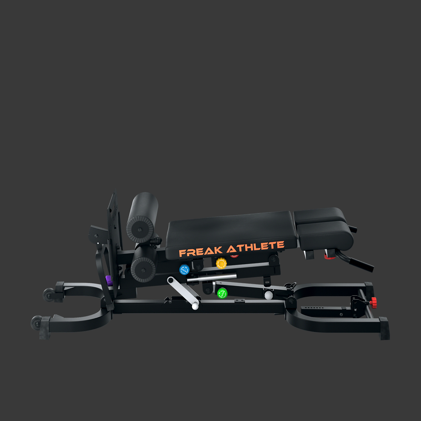 Use the green knob to adjust incline or decline. Recommended position is 20° front incline to create a 25° decline.