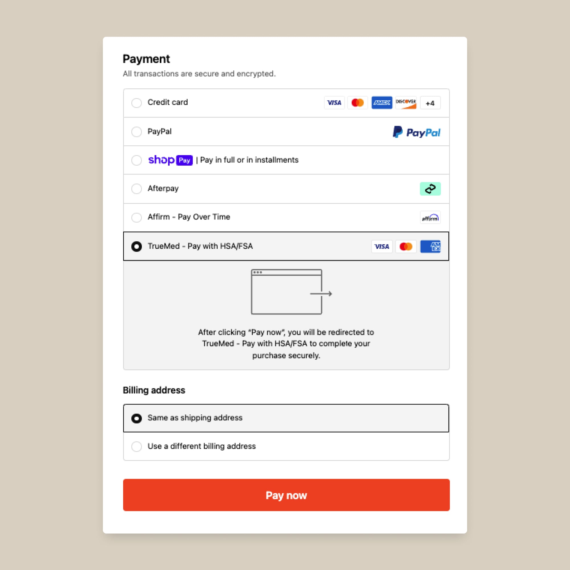At checkout, you’ll see an option to pay with “TrueMed - Pay with HSA/FSA”. Choose this option to proceed then click on “Pay now”.