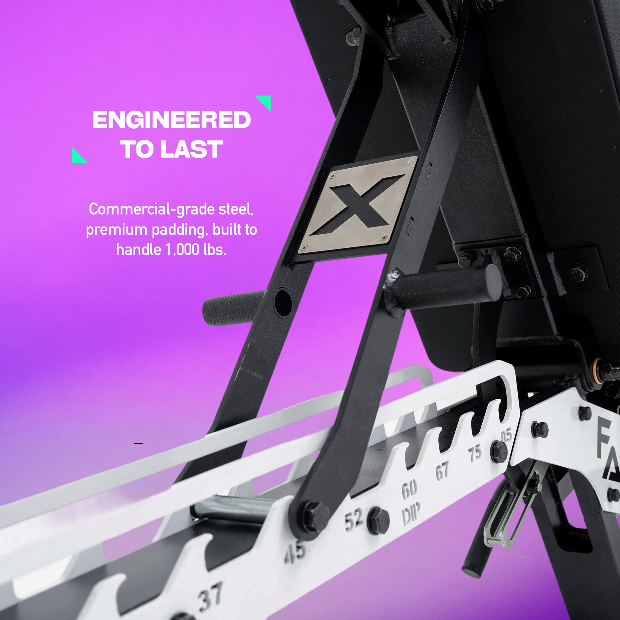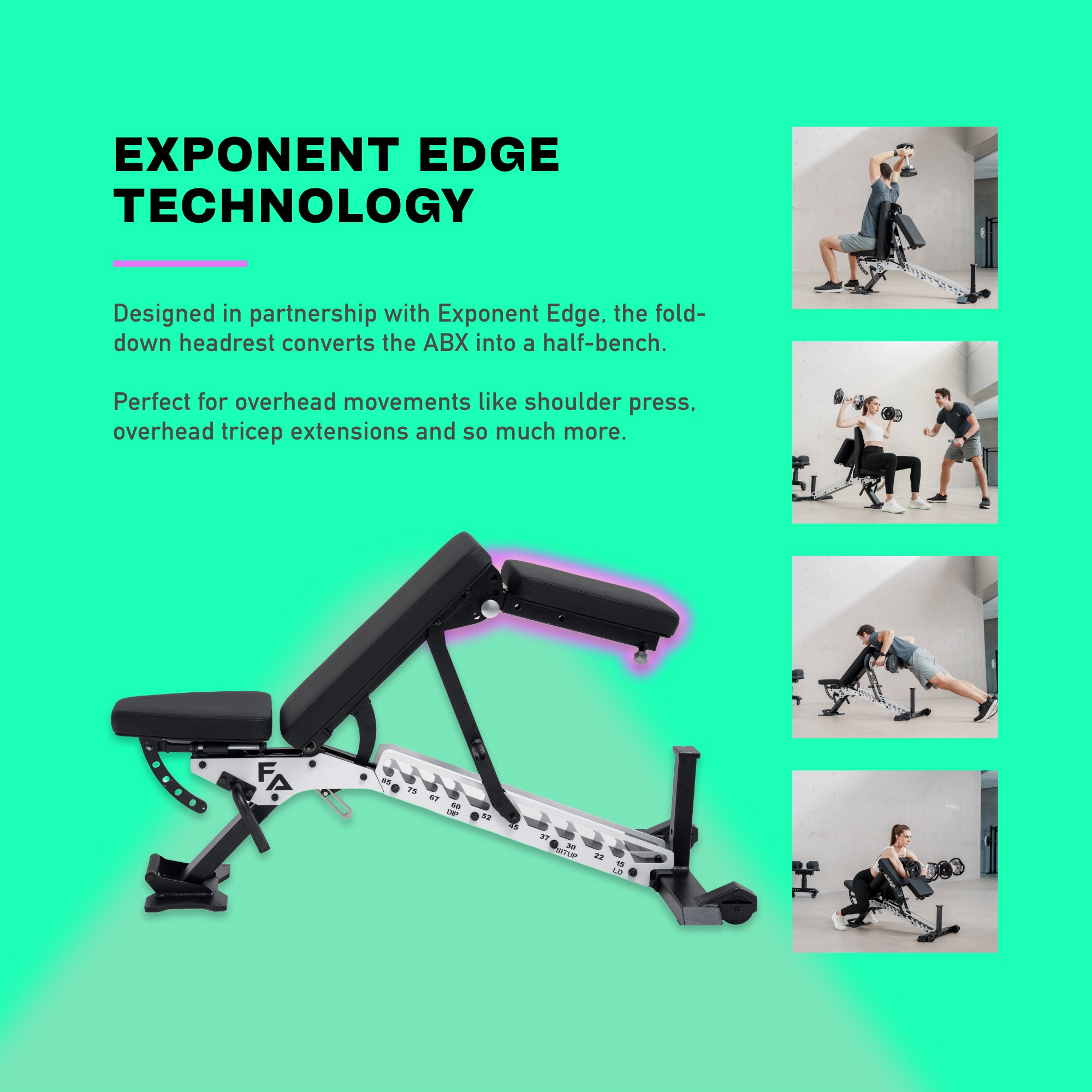 Features an angle-adjustable head rest to unlock full range of motion for overhead work, chest-supported rows, and more. Designed in partnership with Exponent Edge.